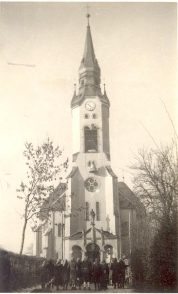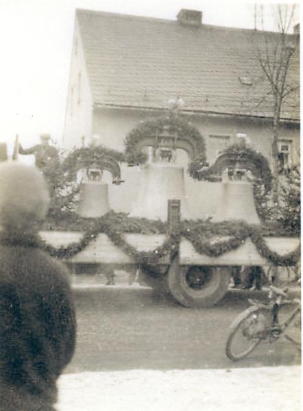 So kamen unsere Glocken wohlbehalten gegen 14:00 Uhr am Ortseingang an, wo Arno Burkert mit seinem kleinen Lastkraftwagen die Gattin des Pfarrers und eine Gruppe junger Mädchen mit Girlanden und Blumen hingebracht hatte. Dort hatten sich schon viele Leute eingefunden, darunter auch der Bürgermeister Richard Horn. Liebevoll wurden der LKW und seine Ladung geschmückt und dann setzte sich das Glocken-Auto in langsamer Fahrt, eskortiert von Kindern aller Altersstufen, Richtung Kirche in Bewegung.