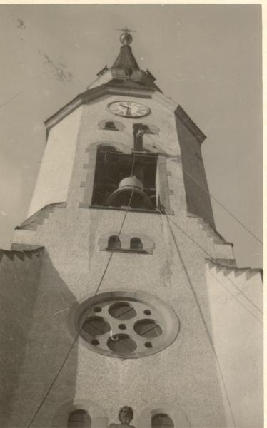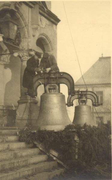Am nächsten Tage wurden die Glocken eine nach der anderen von der Hoch- und Tiefbaufirma Flor und Nestler aus Königswalde auf den Turm gezogen.