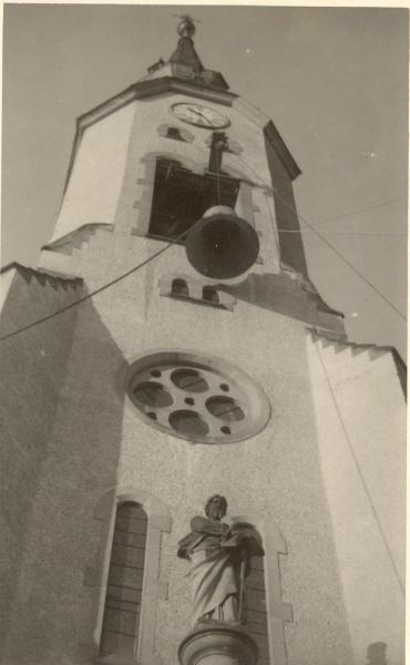 An den Straßen standen unzählige Leute Spalier und begrüßten die neuen Glocken mit Zurufen und Blumen. So kamen die lang ersehnten Glocken nun endlich an unserer Pauluskirche an. Dort wurden sie mit festlichen Lobes- und Dankesliedern der Kantorei und Ansprachen vom Pfarrer und vom Bürgermeister begrüßt. Das ganze Dorf war auf den Beinen, keiner wollte die Sensation verpassen. All die Menschen, die durch ihre Spende, egal ob es das Scherflein der Witwe oder das Taschengeld des Kindes oder die ansehnliche Spende des erfolgreichen Geschäftsmannes war, Anteil an diesen Glocken hatten, konnten sich an diesem Nachmittage voller Stolz und Freude an den Früchten ihrer Großzügigkeit erfreuen. Nach all den Dankesreden und Lobeshymnen wurden die Glocken vom LKW auf ein eigens dafür errichtetes Podest, welches sich an den Treppenstufen des Eingangs der Pauluskirche befand, umgeladen, wo sie auf ihren, für den nächsten Tag geplanten Aufstieg auf den Turm warten sollten. Dabei hätte es fast zur Katastrophe kommen können, als beim Umladen eine Kette riss und die große Glocke wieder zurück auf die Ladefläche des LKW fiel. Zum Glück war sie zu diesem Zeitpunkt nicht allzu hoch, so dass nichts weiter passierte. Nicht auszumalen, was hätte passieren können, wenn die Glocke auf dem Weg in die Höhe zum Glockenstuhl gewesen wäre! Da standen sie nun, unsere Glocken. Der Kirchenvorstand hatte es geschafft, mit Scheinwerfern die Glocken auch in der bald einsetzenden Finsternis für die Schaulustigen sichtbar zu machen.