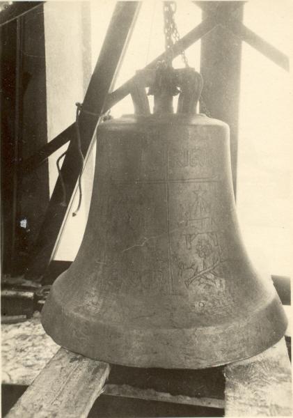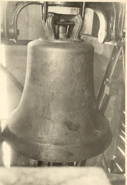 Zitat: "Die große, die tiefe, die Des-Glocke: Sie hängt in der Mitte des Turmes. An ihrer Nordseite, jedoch nicht am Kranze, der überhaupt bei keiner Glocke beschieben ist, steht der erste Teil des Lobpreises der Engel: "Ehre sei Gott in der Höhe!" Inmitten dieser Worte, die etwas auseinandergezogen stehen, ist die Legendengestalt des Christophorus mit dem Jesuskinde auf den Schultern sichtbar. Aber dieser Christophorus ist nicht als Greis, sondern als ein Mann im gereiften Lebensalter dargestellt. Auf der Südseite der Glocke steht geschrieben: