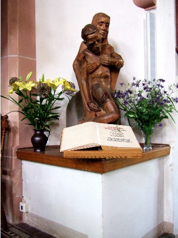 und für die Toten des zweiten Weltkrieges mit einer hölzernen Pieta am Fuße der Kanzel, geschaffen von Frau Viola Nahmacher aus Greiz.