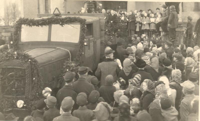 So kamen unsere Glocken wohlbehalten gegen 14:00 Uhr am Ortseingang an, wo Arno Burkert mit seinem kleinen Lastkraftwagen die Gattin des Pfarrers und eine Gruppe junger Mädchen mit Girlanden und Blumen hingebracht hatte. Dort hatten sich schon viele Leute eingefunden, darunter auch der Bürgermeister Richard Horn. Liebevoll wurden der LKW und seine Ladung geschmückt und dann setzte sich das Glocken-Auto in langsamer Fahrt, eskortiert von Kindern aller Altersstufen, Richtung Kirche in Bewegung.