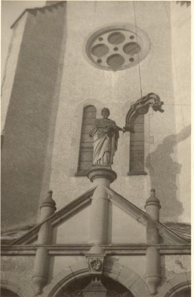 Zitat: "Die große, die tiefe, die Des-Glocke: Sie hängt in der Mitte des Turmes. An ihrer Nordseite, jedoch nicht am Kranze, der überhaupt bei keiner Glocke beschieben ist, steht der erste Teil des Lobpreises der Engel: "Ehre sei Gott in der Höhe!" Inmitten dieser Worte, die etwas auseinandergezogen stehen, ist die Legendengestalt des Christophorus mit dem Jesuskinde auf den Schultern sichtbar. Aber dieser Christophorus ist nicht als Greis, sondern als ein Mann im gereiften Lebensalter dargestellt. Auf der Südseite der Glocke steht geschrieben: